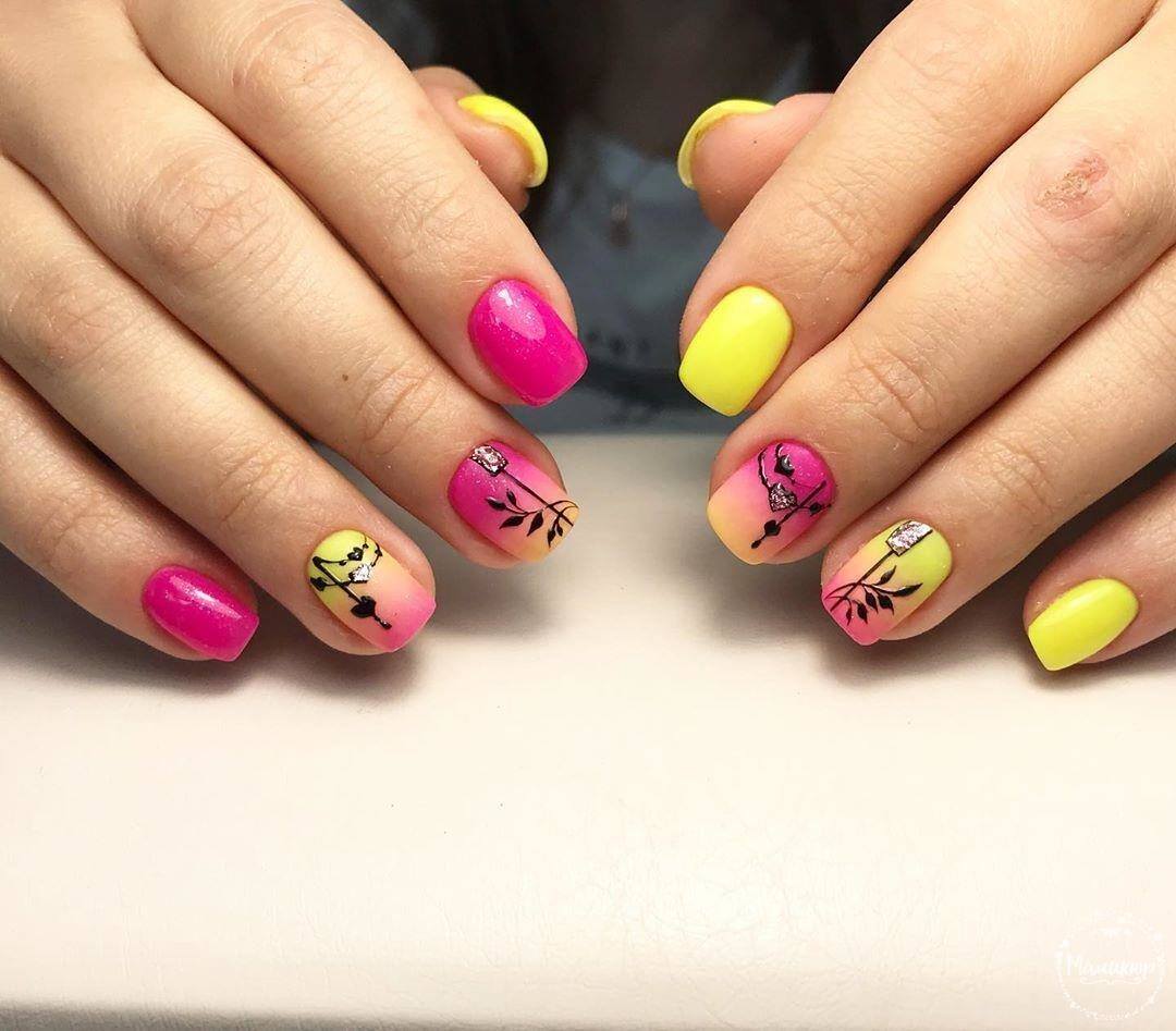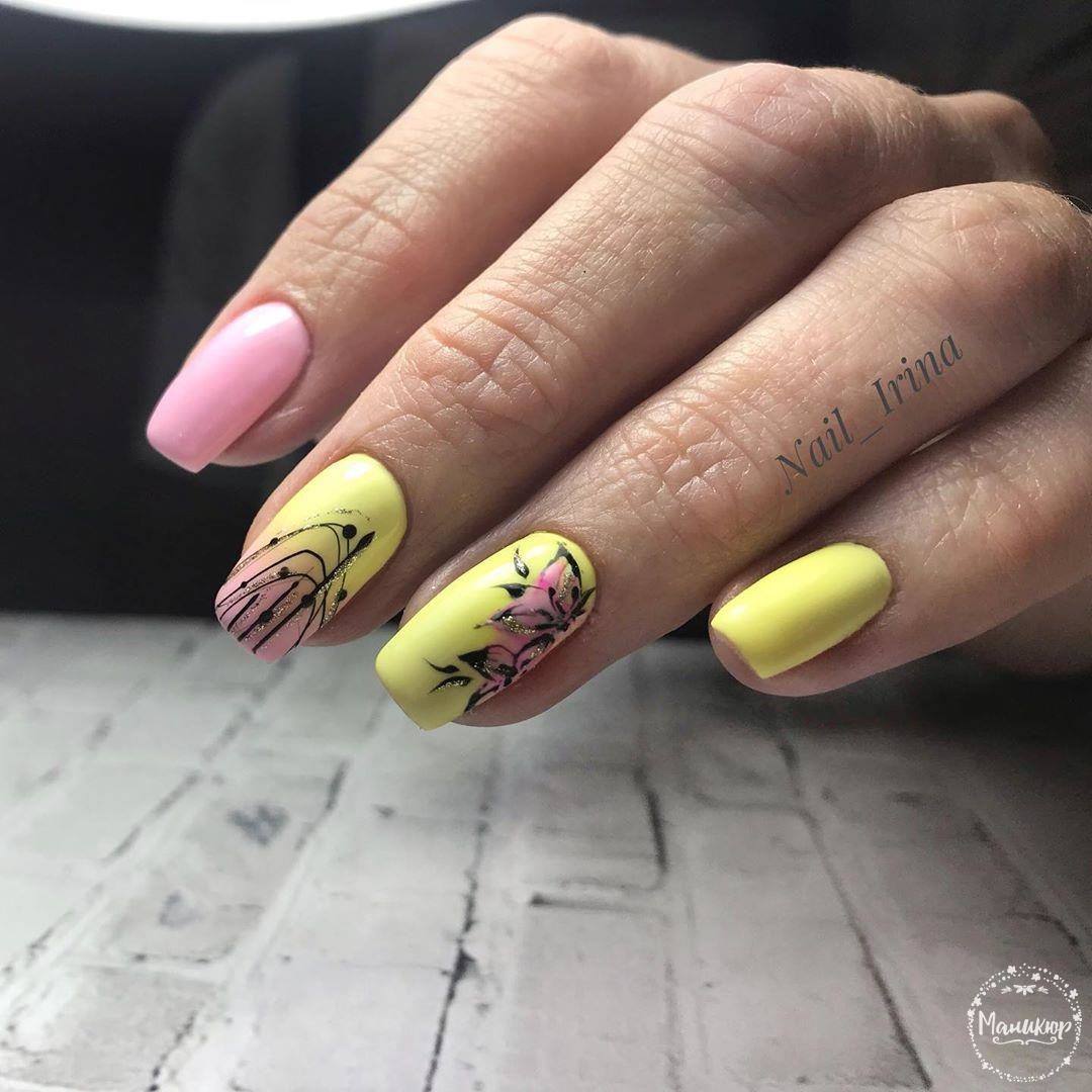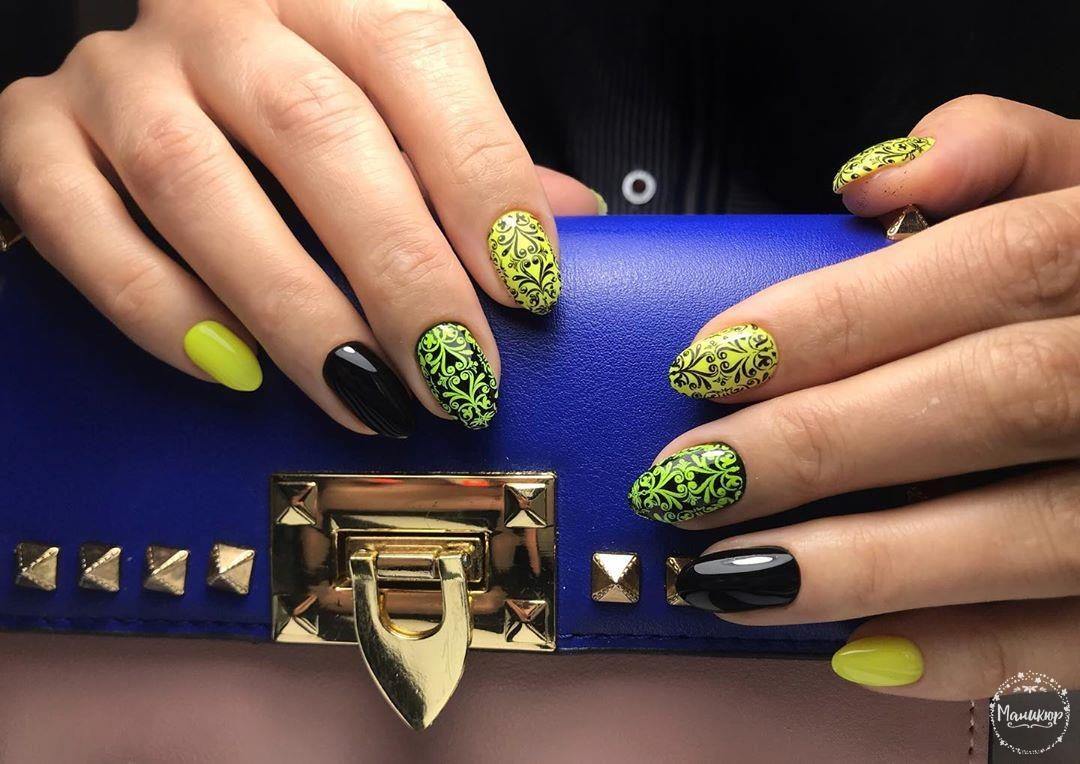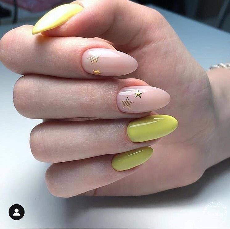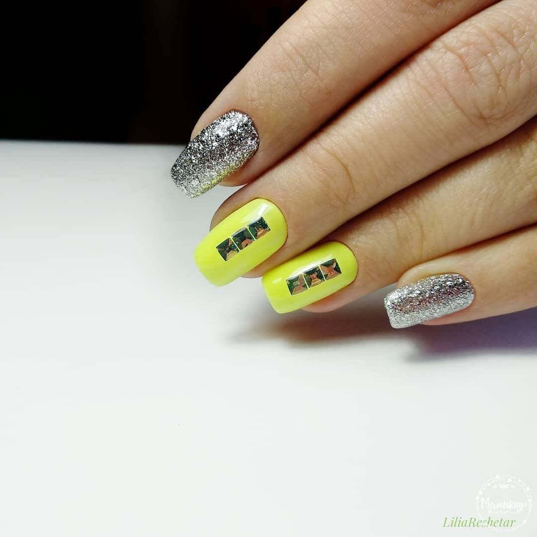 La combinaison de plusieurs couleurs dans une manucure est particulièrement utile en été. Une teinte jaune juteuse et jaune vif peut parfaitement remonter le moral et faire face à la tristesse. La combinaison de manucure jaune-vert convient à toutes les longueurs et formes des ongles. La gradation des tons et des nuances de ces couleurs est incroyablement large. Il comprend des couleurs telles que le vert clair, le citron, les marais, le beige, ainsi que des nuances plus douces et saturées. En ce qui concerne les méthodes de conception, vous pouvez appliquer n'importe quoi: perles, dessins, étincelles, motifs ou strass. Choisissez un décor à votre goût!