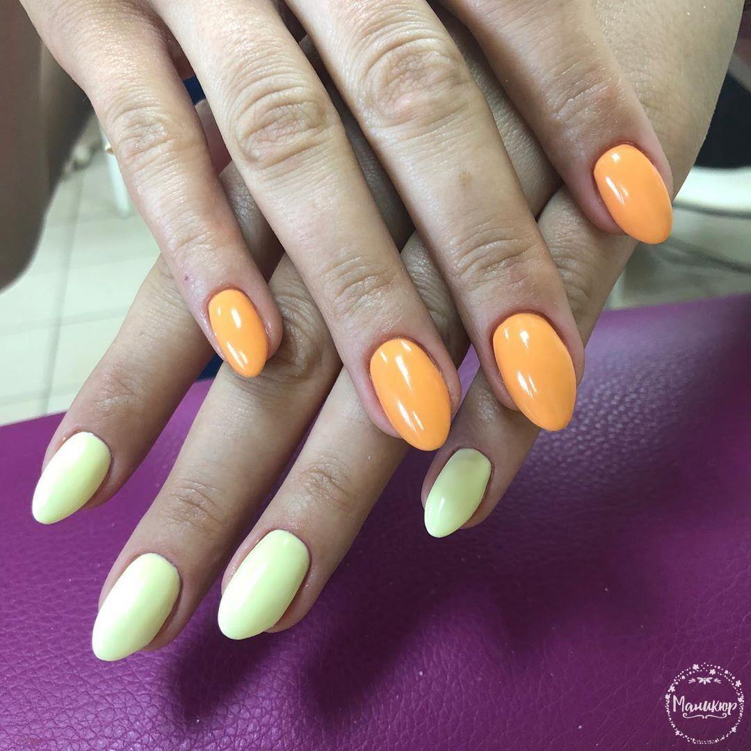 Les options les plus élégantes et les plus élégantes pour la manucure jaune en 2026 sont combinées de manière inégalée avec le vernis orange. Malgré le fait que ces deux couleurs soient similaires, elles sont incroyablement différentes et peuvent transformer le nail art en une véritable œuvre d'art. Les couleurs jaunes juteuses complètent parfaitement le ton orange calme et vice versa.