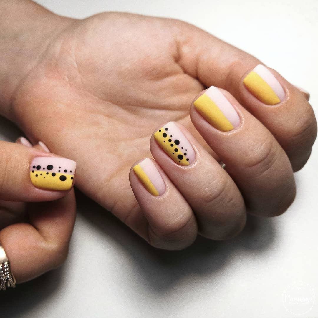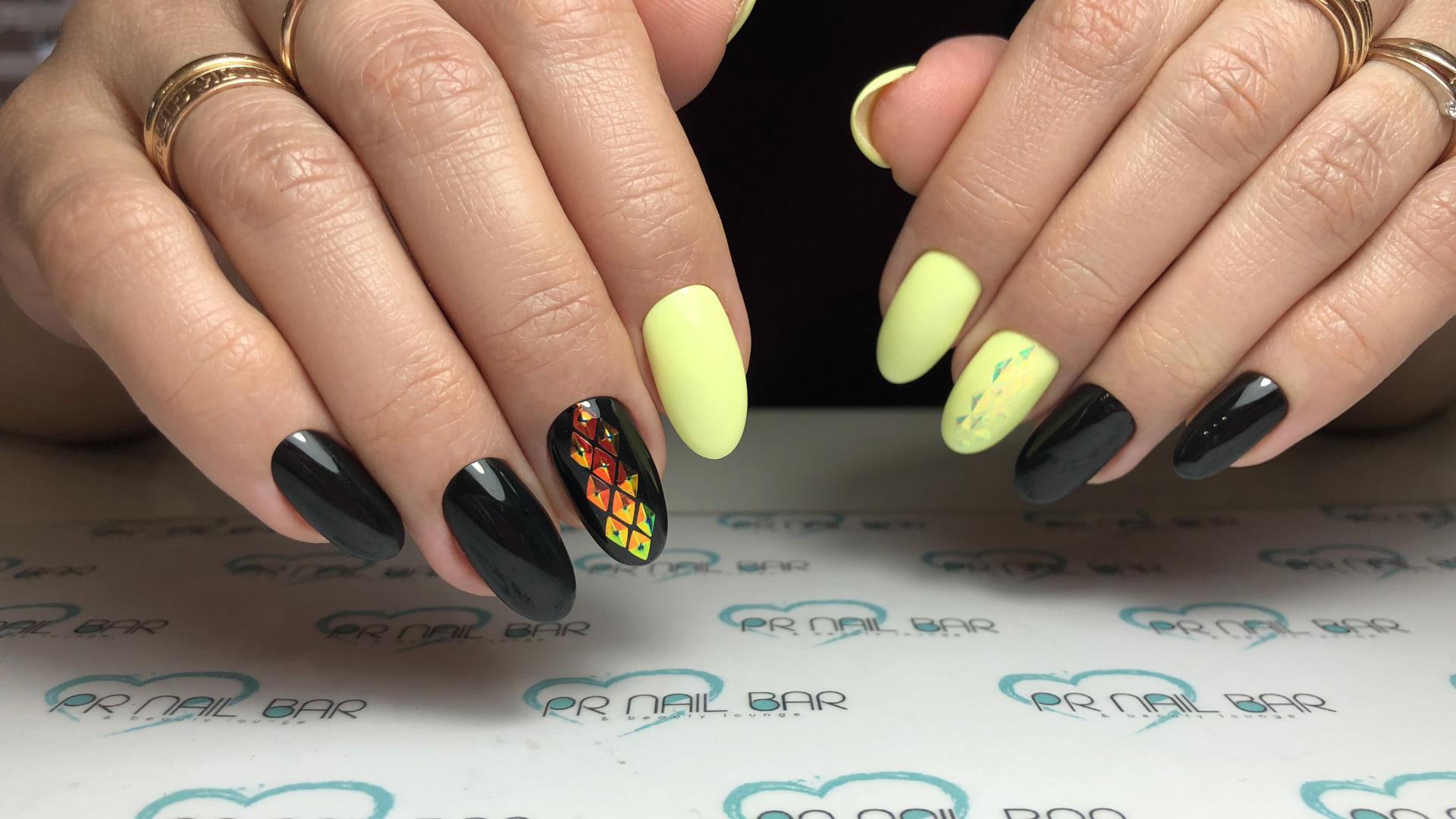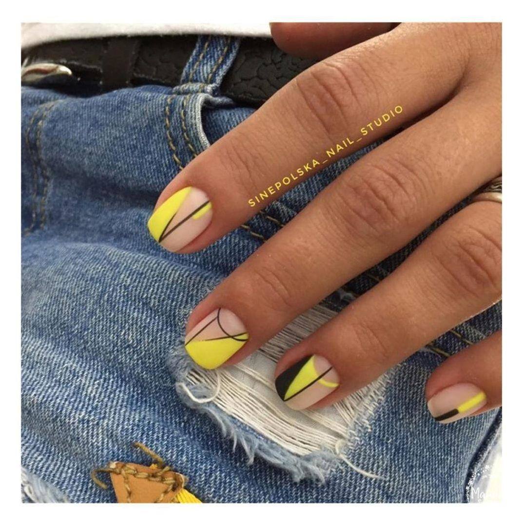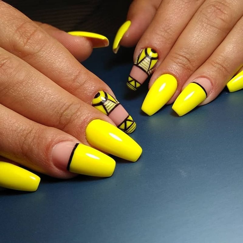 Manucure jaune élégante avec l'ajout de noir