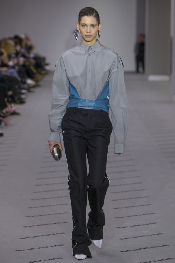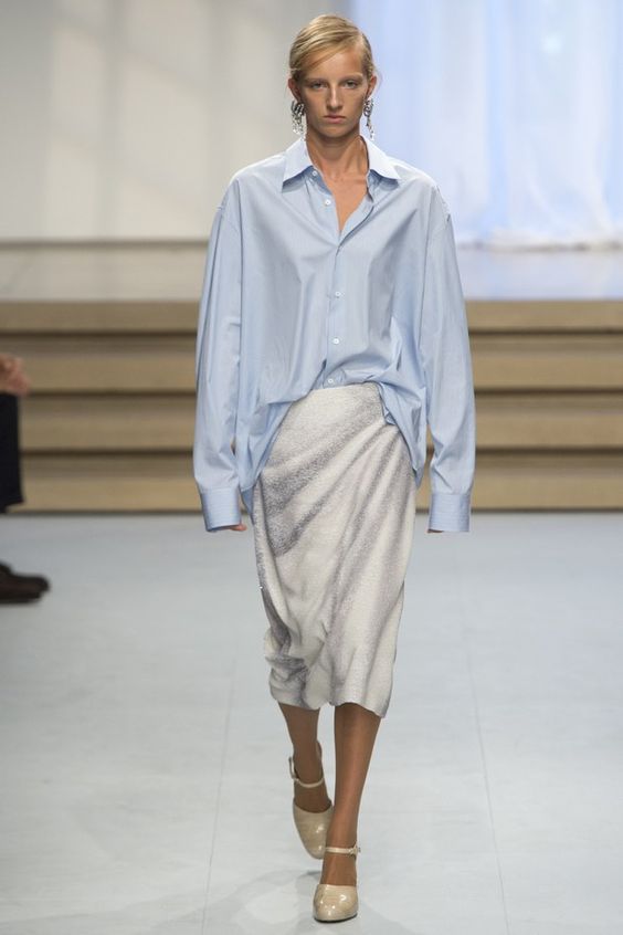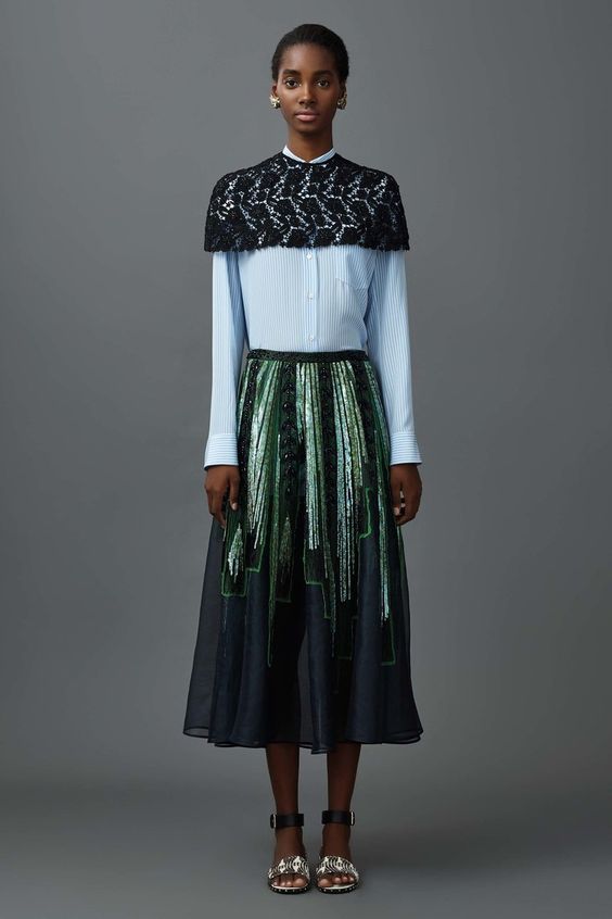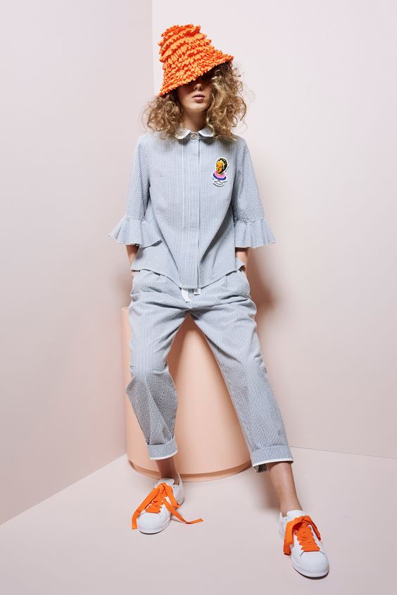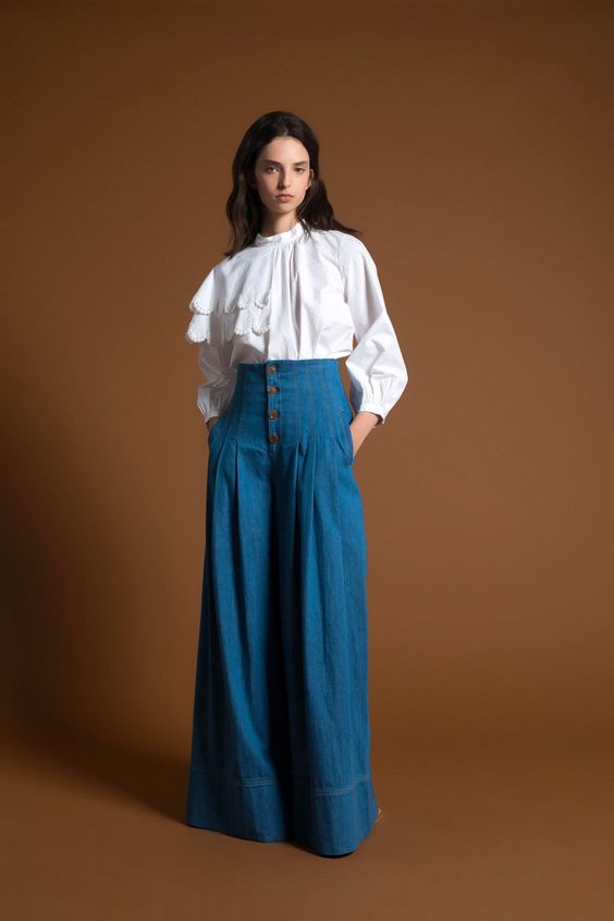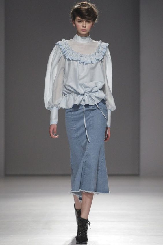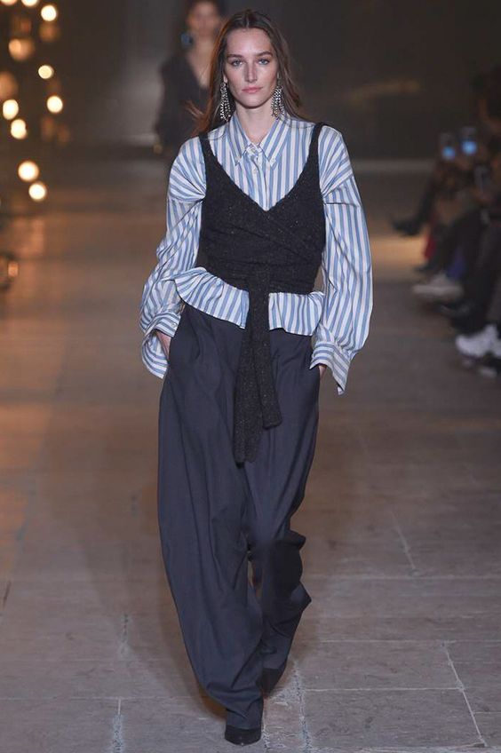 Les blouses en fine bande bleue ne sont pas moins élégantes. Cette tendance n'est pas pertinente pour la première saison. Par conséquent, les modeuses peuvent continuer à faire des images intéressantes avec un tel élément de la garde-robe.