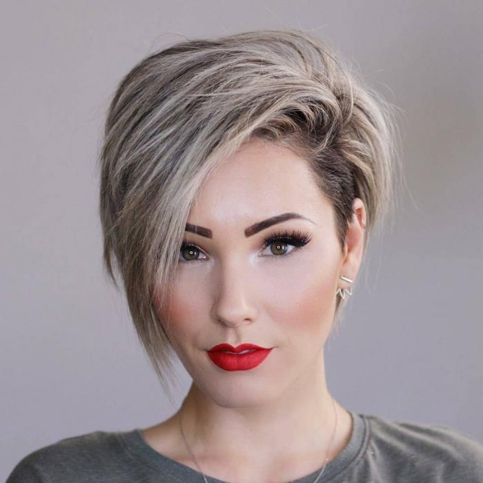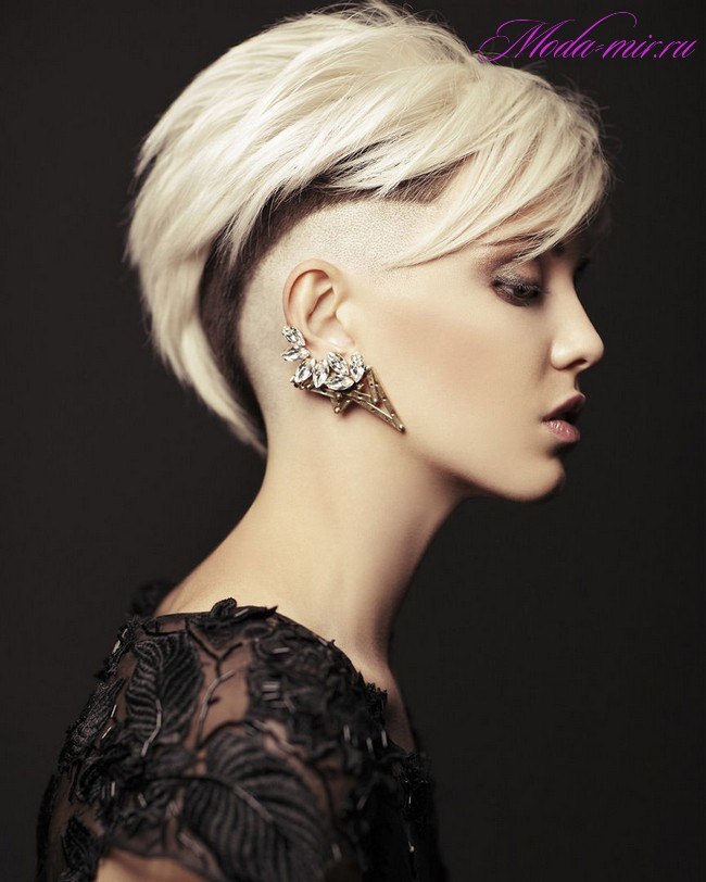 Les coupes de cheveux courtes de la saison nous surprendront par leur variété d'images androgynes. En coupant les temples, vous obtiendrez un effet saisissant et une coupe masculine audacieuse exprimera une féminité franche. Cette décision audacieuse pendant la saison froide vous permettra de rajeunir pendant plusieurs années et de montrer à quel point la femme est audacieuse et sexy. Ainsi, vous pouvez déclarer au monde entier que vous êtes une femme élégante et déterminée qui sait exactement ce qu'elle veut de la vie. La chose la plus importante dans cette coupe de cheveux est de créer un volume d’air avec une goutte de chute. Avec un simple peignage des cheveux en arrière pour obtenir cet effet n'est pas du tout difficile.