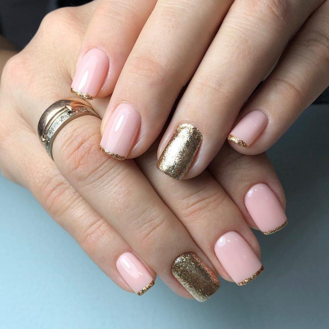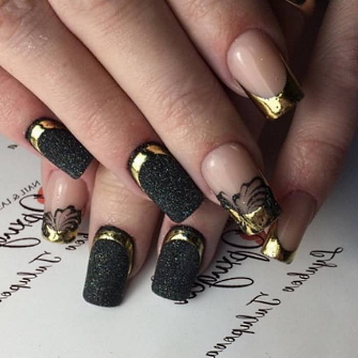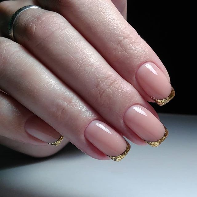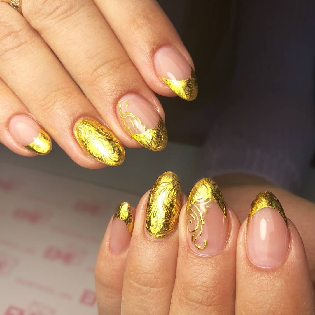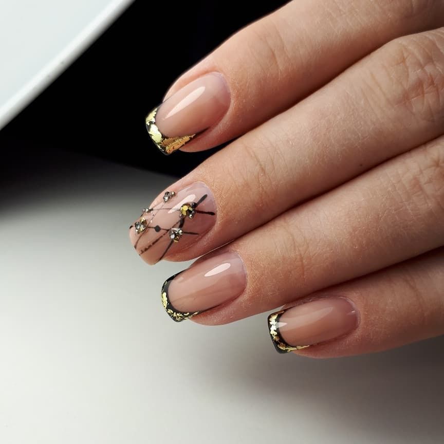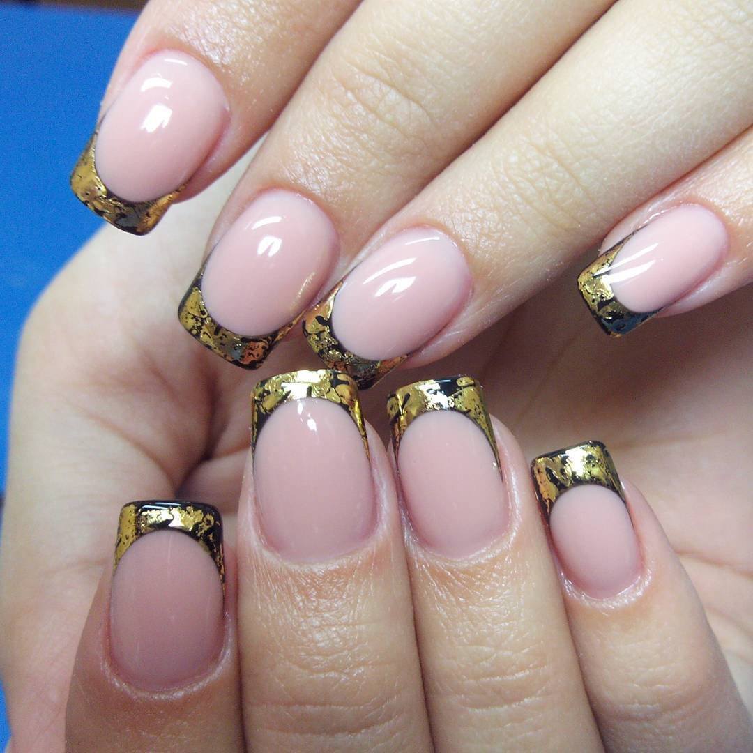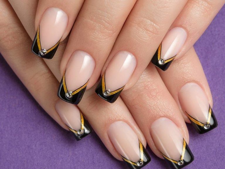 La plupart des représentants du sexe féminin ont un désir particulier de remplir la veste en or précisément pour des occasions spéciales. Ce style de manucure a l’air élégant et donne une poussée particulière d’émotions. Mais dans certains cas, cette option est trop frappante. Par conséquent, en tant que décor supplémentaire, il est intéressant d’appliquer plusieurs lignes fines et des points dans une nuance noire. Ainsi, une manucure française en or deviendra une décoration incroyablement chic et à la mode des stylos pour femmes.