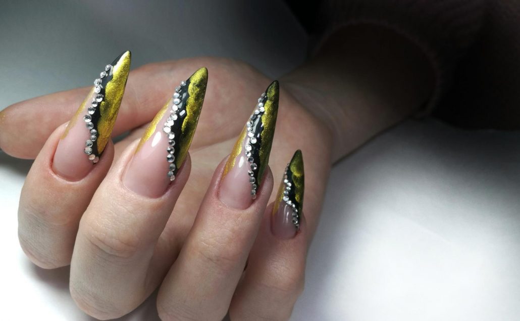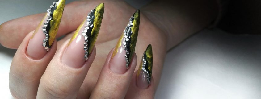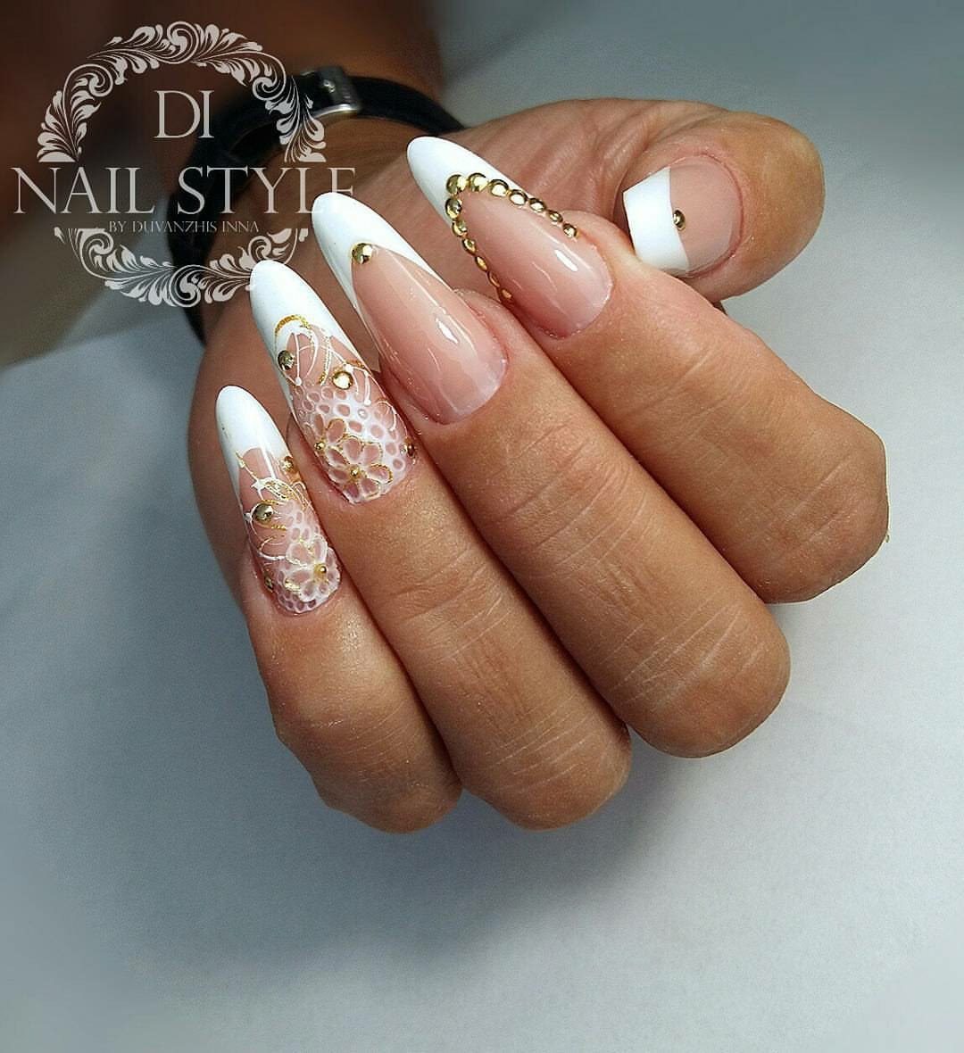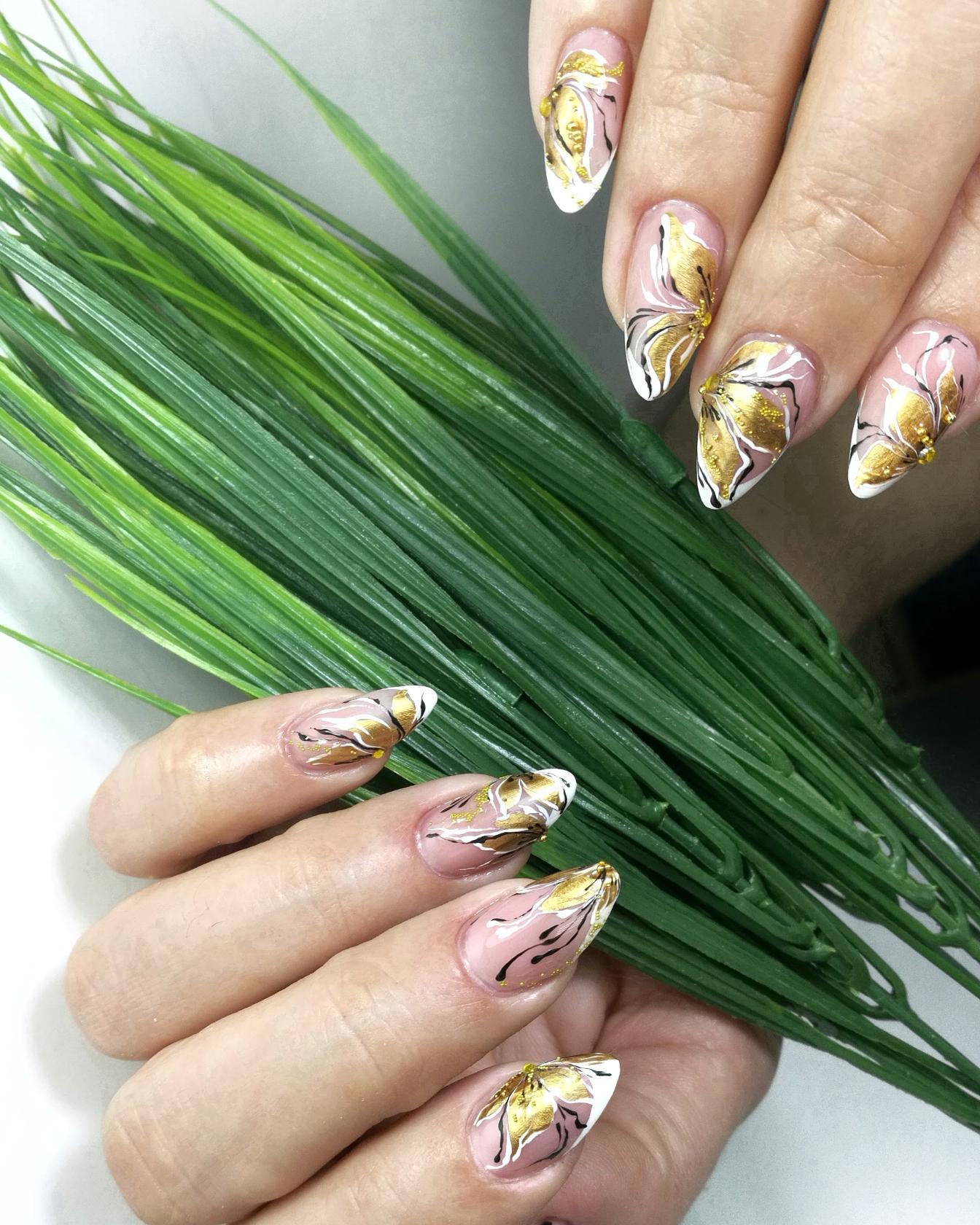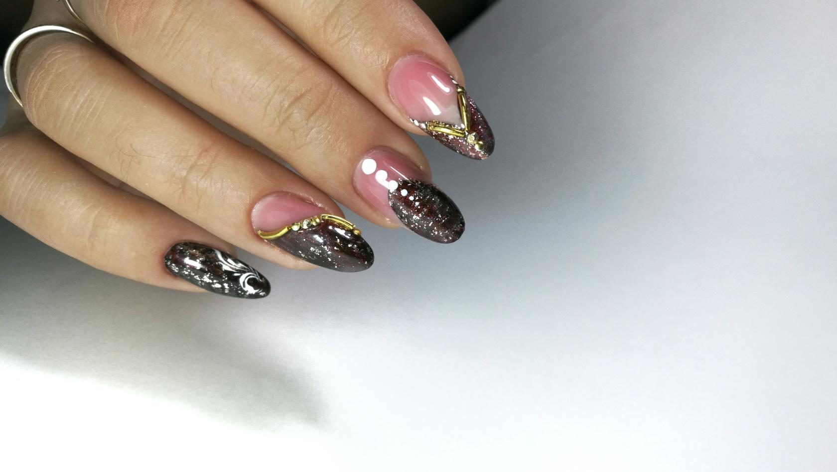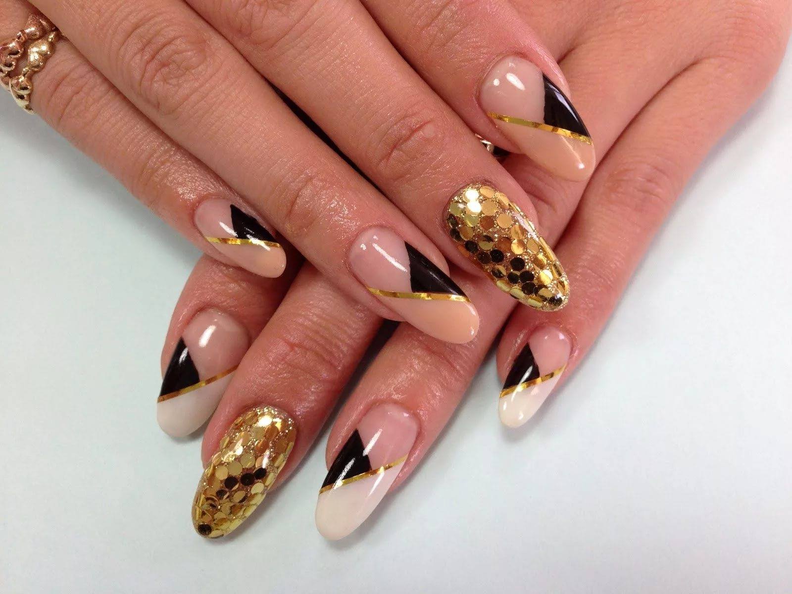 La plupart des représentants du sexe féminin ont un désir particulier de remplir la veste en or précisément pour des occasions spéciales. Ce style de manucure a l’air élégant et donne une poussée particulière d’émotions. Mais dans certains cas, cette option est trop frappante. Par conséquent, en tant que décor supplémentaire, il est intéressant d’appliquer plusieurs lignes fines et des points dans une nuance noire. Ainsi, une manucure française en or deviendra une décoration incroyablement chic et à la mode des stylos pour femmes.