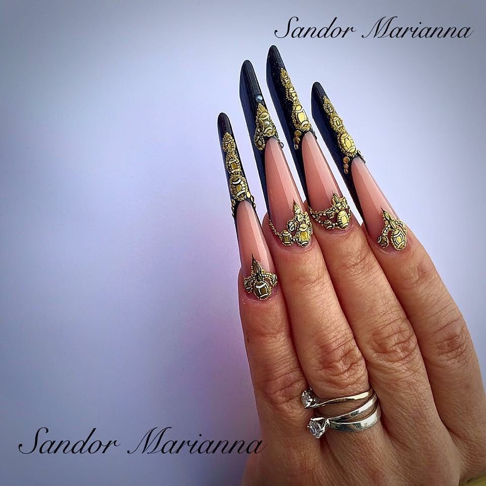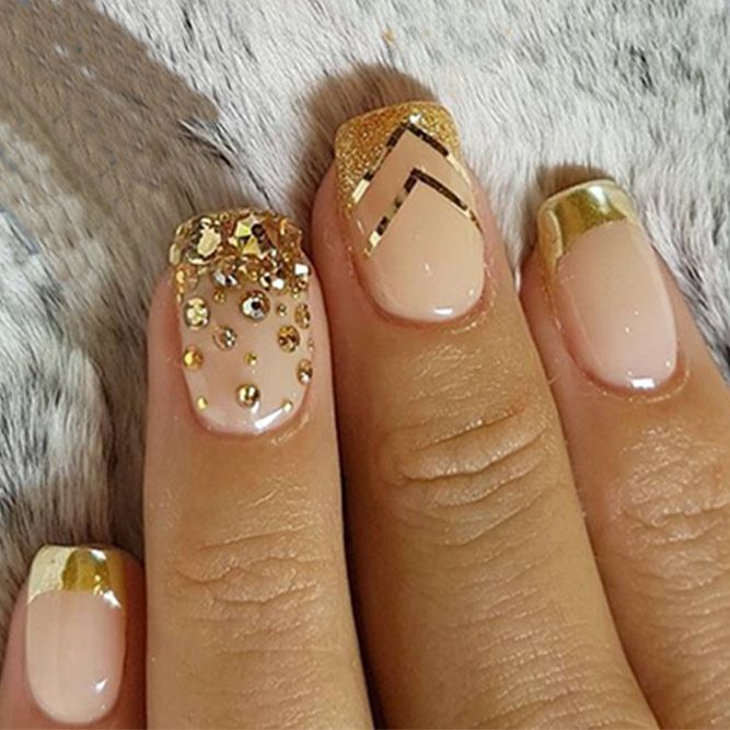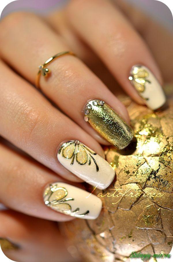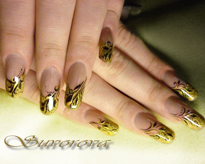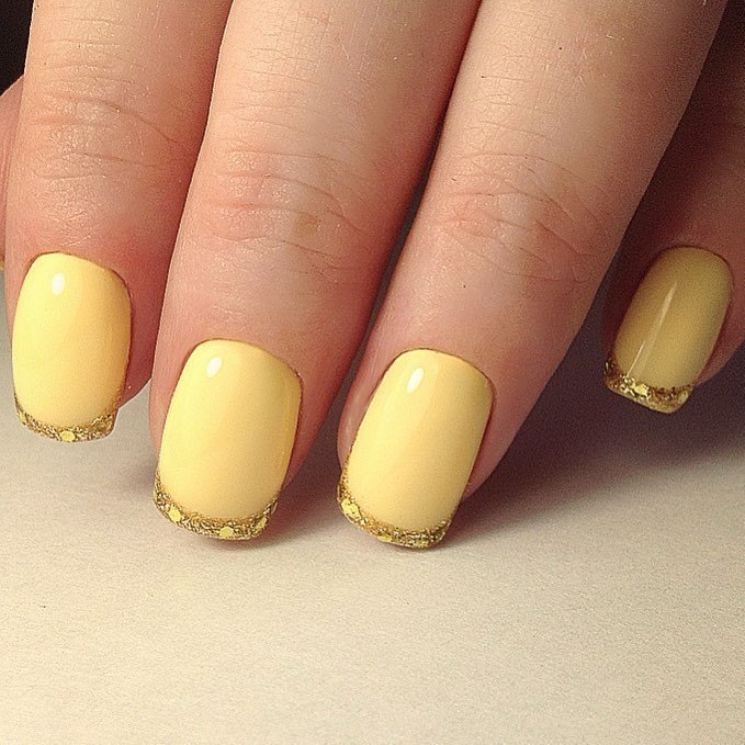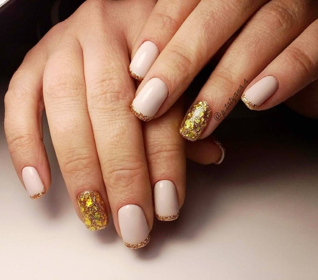 Trop de nuances d'or semblent vulgaires. Par conséquent, avec ce choix de conception des soucis, il convient de respecter le cadre d'intensité admissible. Par exemple, si vous êtes toujours intéressé par une veste en or sur un fond doré, la nuance principale doit être légèrement plus pâle que la ligne du sourire.Mais il convient de noter que cette option de conception peut fusionner avec une garde-robe jaune. Une telle manucure est assez originale et mignonne avec une robe classique noire ou un tailleur pantalon.