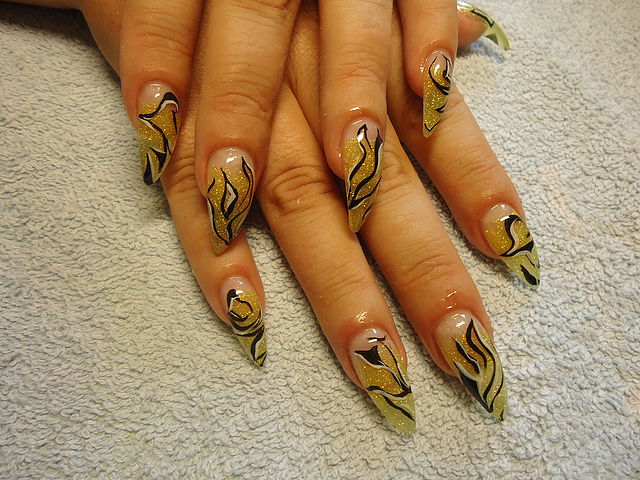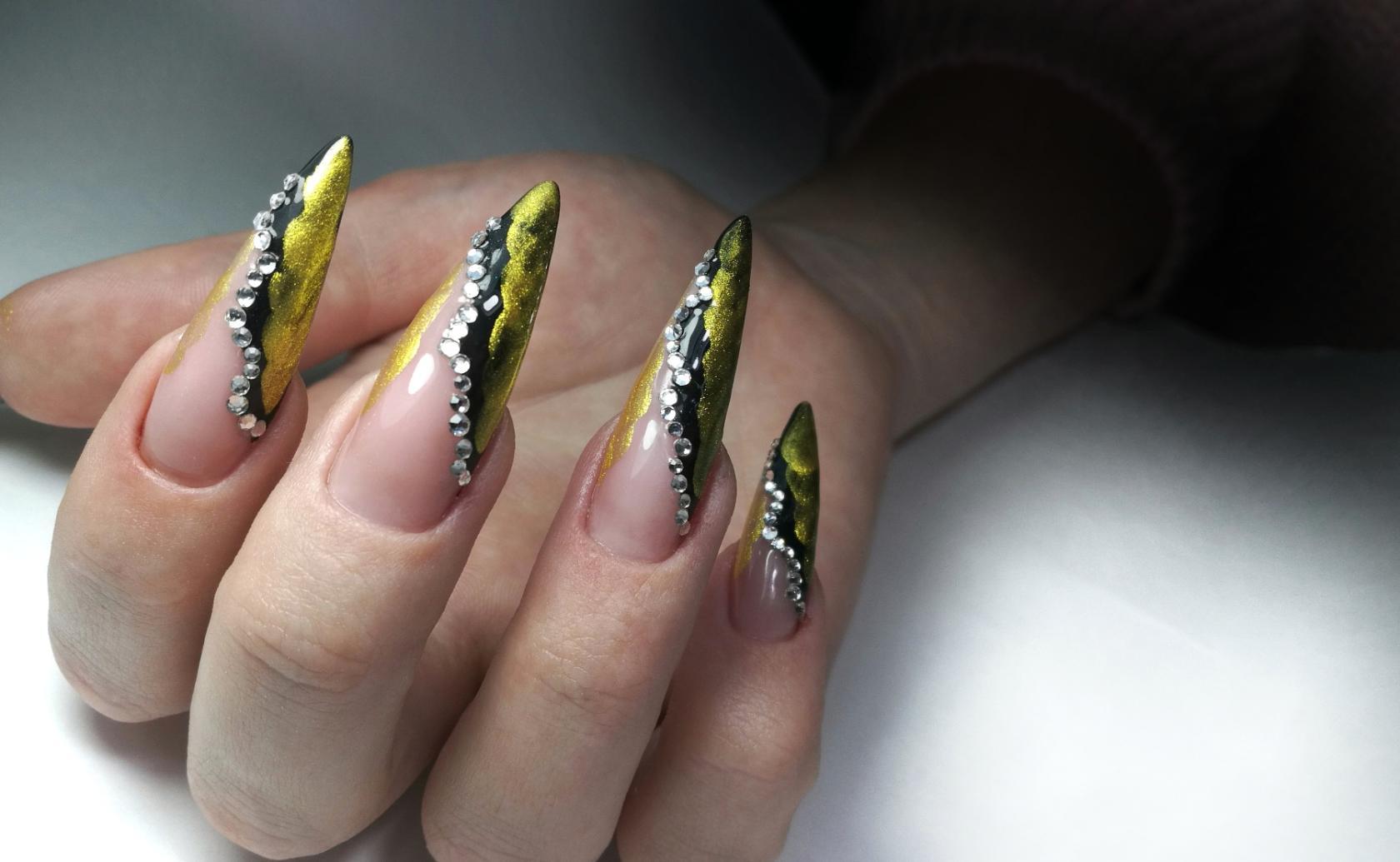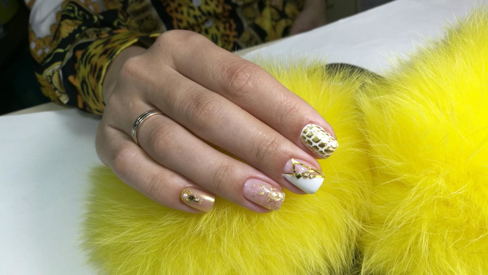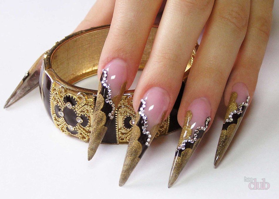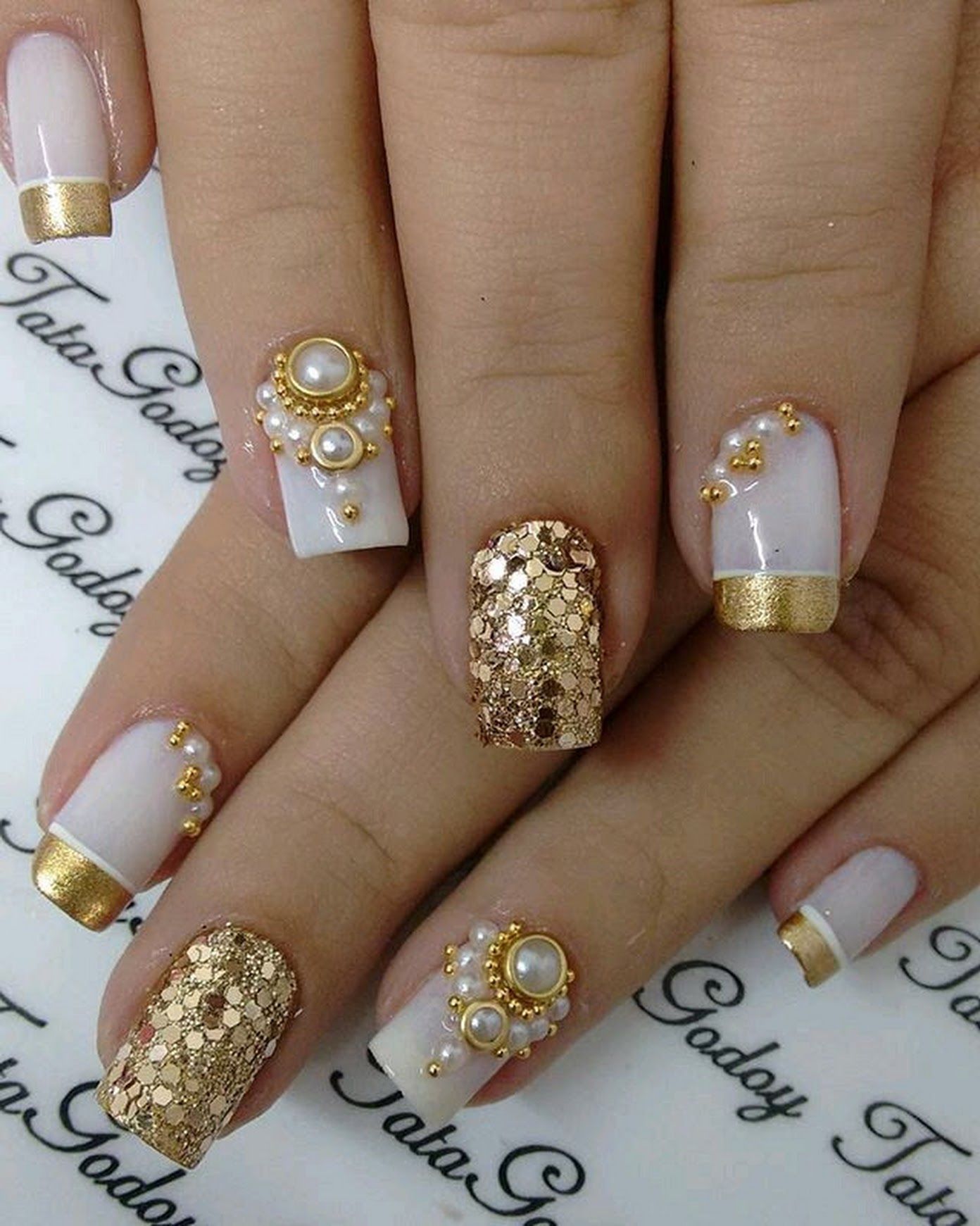 Trop de nuances d'or semblent vulgaires. Par conséquent, avec ce choix de conception des soucis, il convient de respecter le cadre d'intensité admissible. Par exemple, si vous êtes toujours intéressé par une veste en or sur un fond doré, la nuance principale doit être légèrement plus pâle que la ligne du sourire.Mais il convient de noter que cette option de conception peut fusionner avec une garde-robe jaune. Une telle manucure est assez originale et mignonne avec une robe classique noire ou un tailleur pantalon.