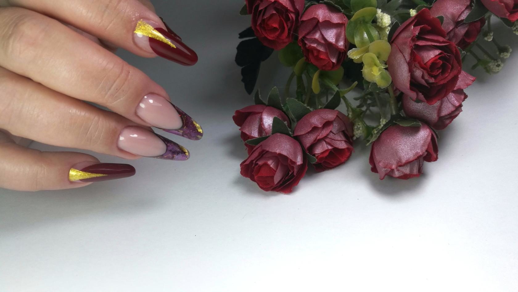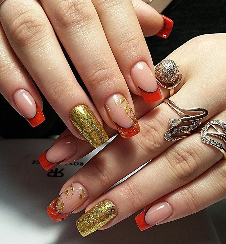 D'accord, si vous couvrez la totalité de la plaque à ongles avec un vernis doré, la manucure n'aura pas une apparence élégante et modeste. L'image féminine avec une manucure française sera assez originale et incroyablement douce, où les extrémités blanches habituelles seront remplacées par des lignes arrondies dorées. Ainsi, la manucure moderne sera élégante et mignonne. En tant que vernis principal, vous pouvez utiliser non seulement des nuances pastel et nude, mais également des couleurs noire, rouge et bordeaux.