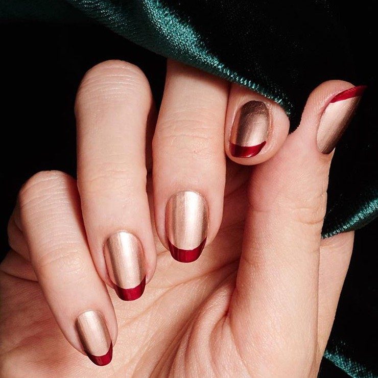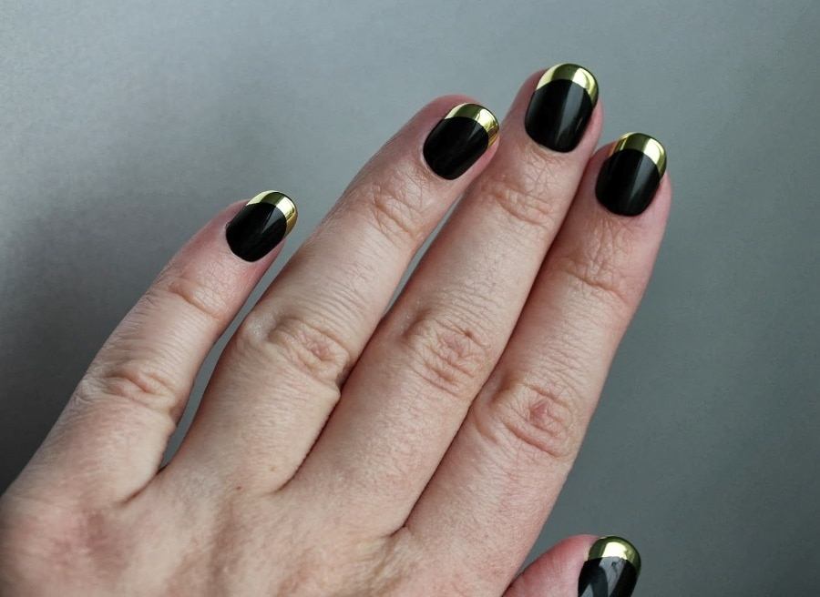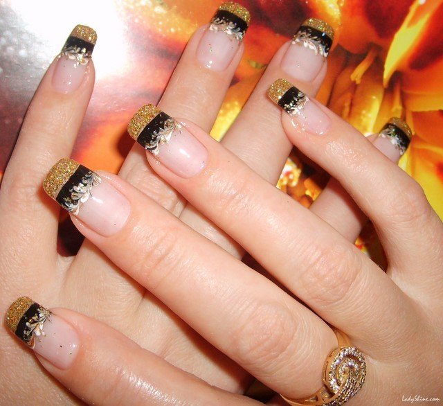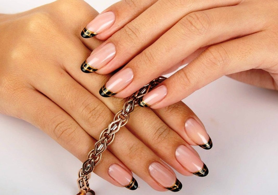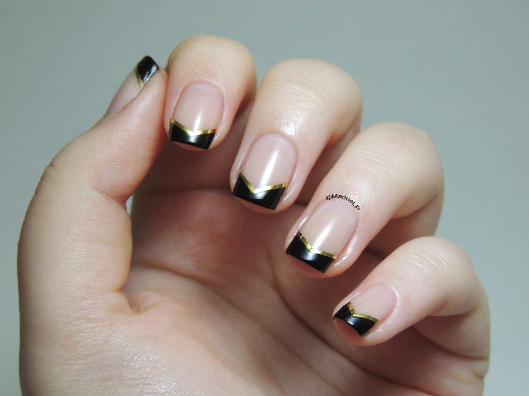 De nos jours, les maîtres manucures modernes proposent souvent de prendre un peu de recul par rapport aux classiques et d’expérimenter un peu. Cela s'applique même à la manucure française. Nous suggérons d’envisager l’une des options existantes. Le bord de l'ongle doit être décoré non pas avec une nuance de vernis, mais avec deux couleurs. Par exemple, or et noir. Ainsi, votre manucure acquerra un look élégant et en même temps chic. Au lieu du noir, vous pouvez utiliser le rouge, le marron et même le bleu.