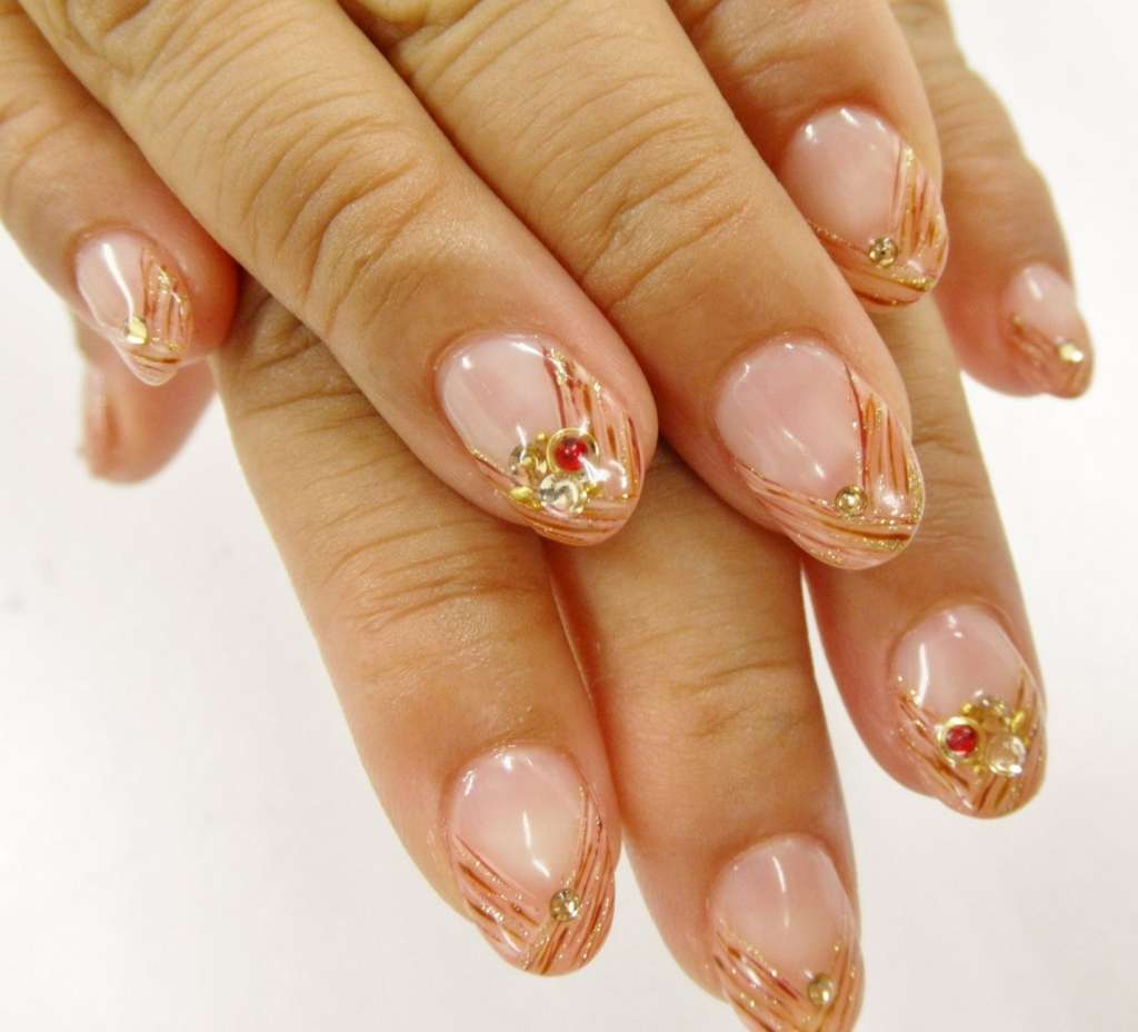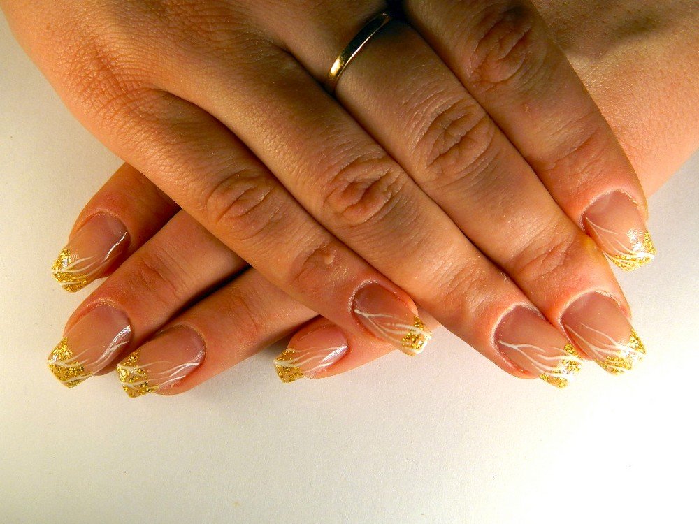 Nous attirons votre attention sur plusieurs variantes de la veste de couleur or, qui permet de donner aux poignées des femmes un look riche mais à la fois modeste. L'option la plus simple et la plus mignonne est une veste, où le ton principal est joué dans une nuance beige ou transparente. Les pointes des ongles sont recouvertes d'une couleur dorée. Une telle manucure ne se concentrera pas sur elle-même. Au lieu d'un revêtement de laque d'or, vous pouvez utiliser une feuille. Mais les filles modernes donnent leur préférence aux scintillements dorés. Pour une harmonie parfaite, le ton de base est recouvert d’une légère couche de vernis brillant. Pour une manucure française plus précise, de nombreux appareils peuvent aider à remplir la ligne du sourire. Ces appareils sont vendus littéralement dans tous les magasins. Celles-ci peuvent être des rayures ordinaires. Mais parfois, ils n'existent tout simplement pas. Dans ce cas, ils sont remplacés par le segment habituel d’une bande. L'essentiel est qu'il ait une base collante. À l'aide de ciseaux, il est nécessaire de couper la bande de la bonne taille et de l'appliquer sur la plaque à ongles.