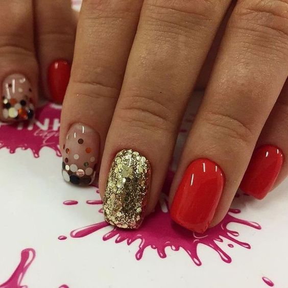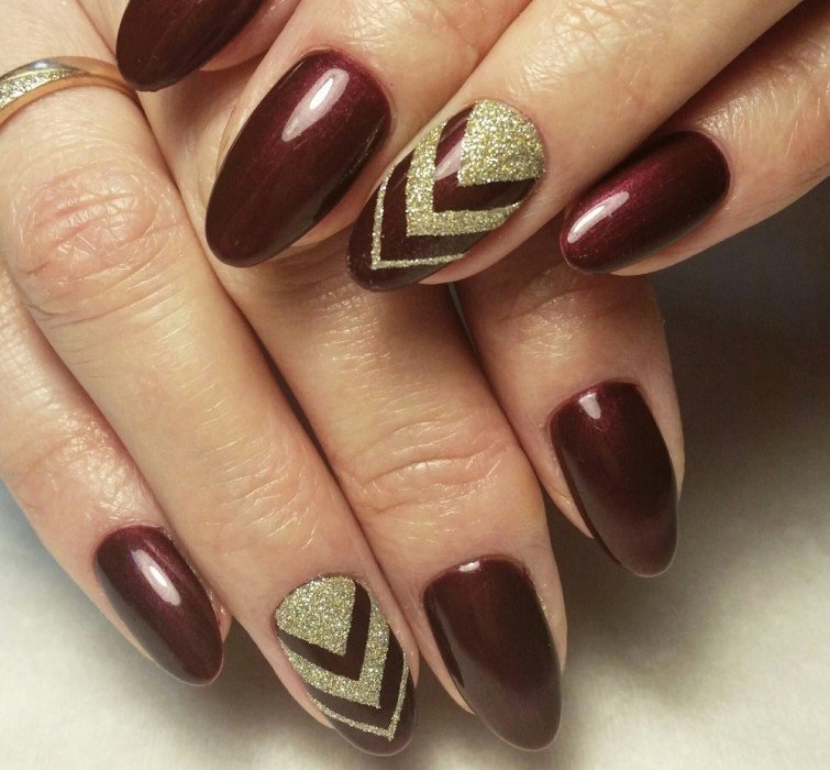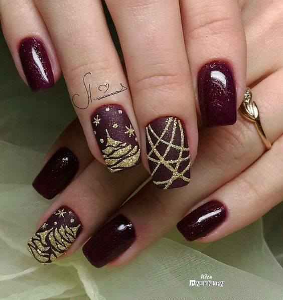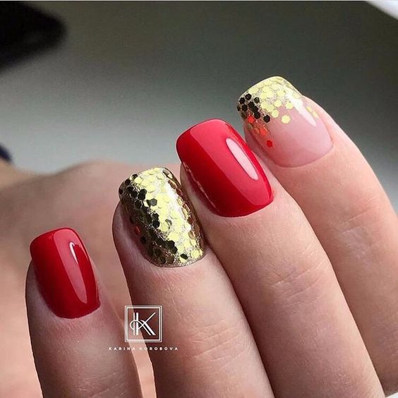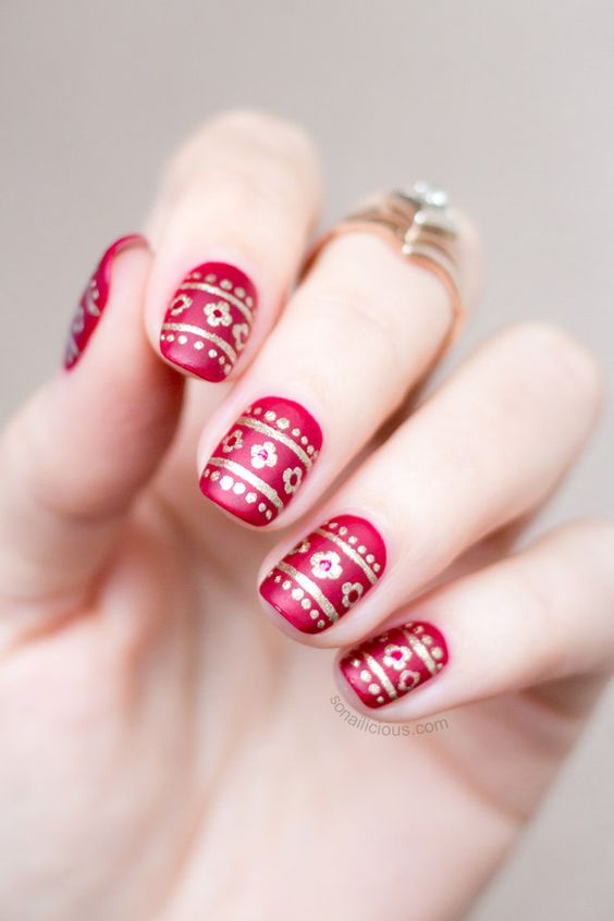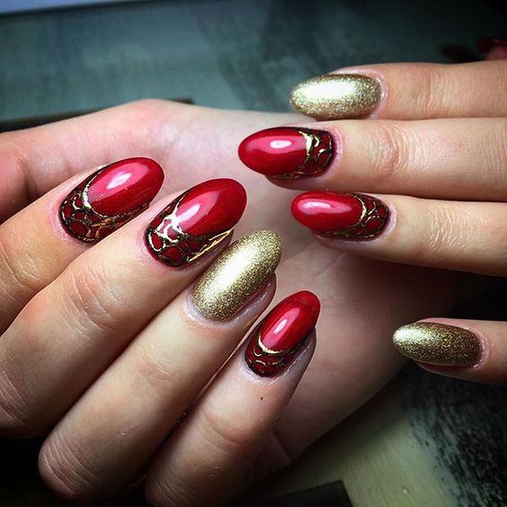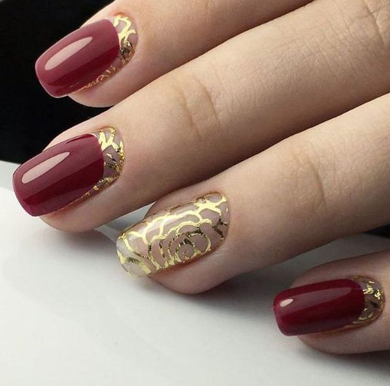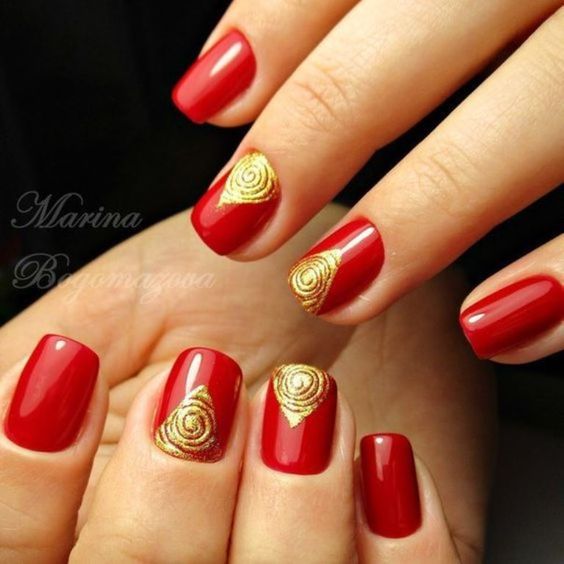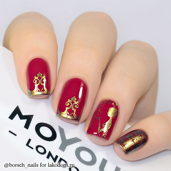De plus, vous pouvez choisir absolument n'importe quelle nuance de rouge, même de vin ou d'écarlate. En combinaison avec de l'or, chacun d'eux aura l'air vraiment luxueux. Soit dit en passant, le vernis ne doit pas nécessairement être de l'or. N'hésitez pas à choisir des strass dans cette nuance, scotch tape ou même décalcomanies.