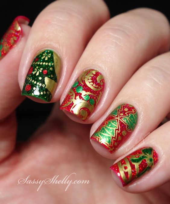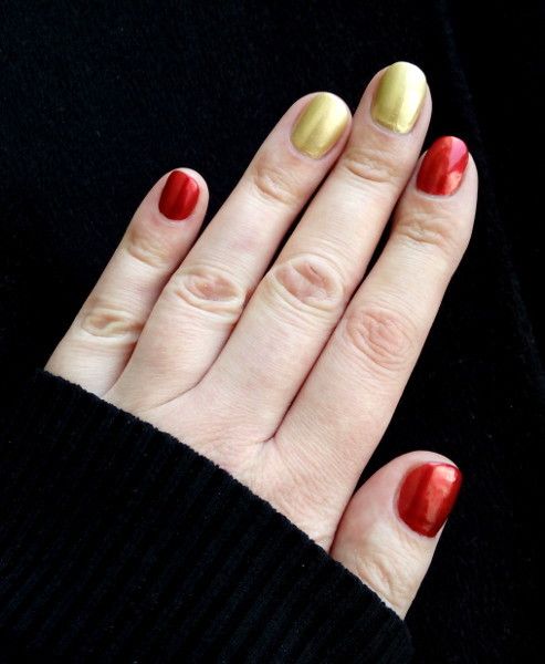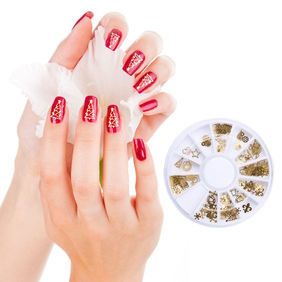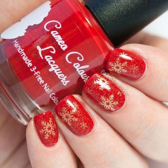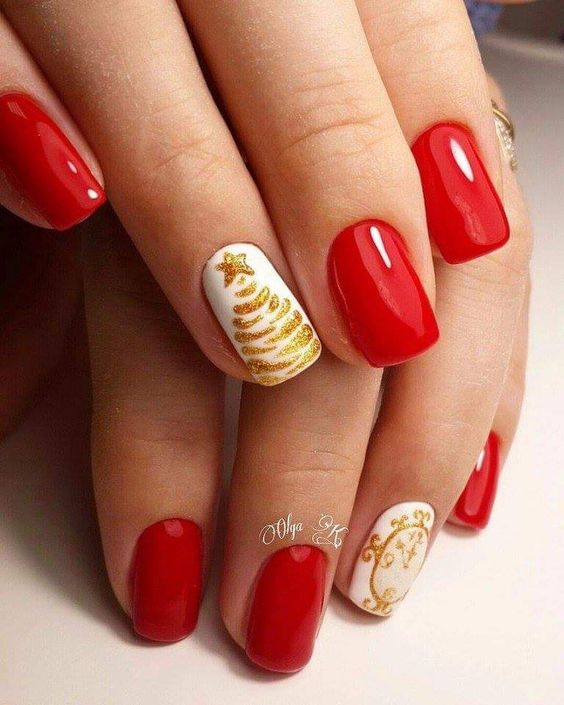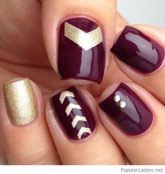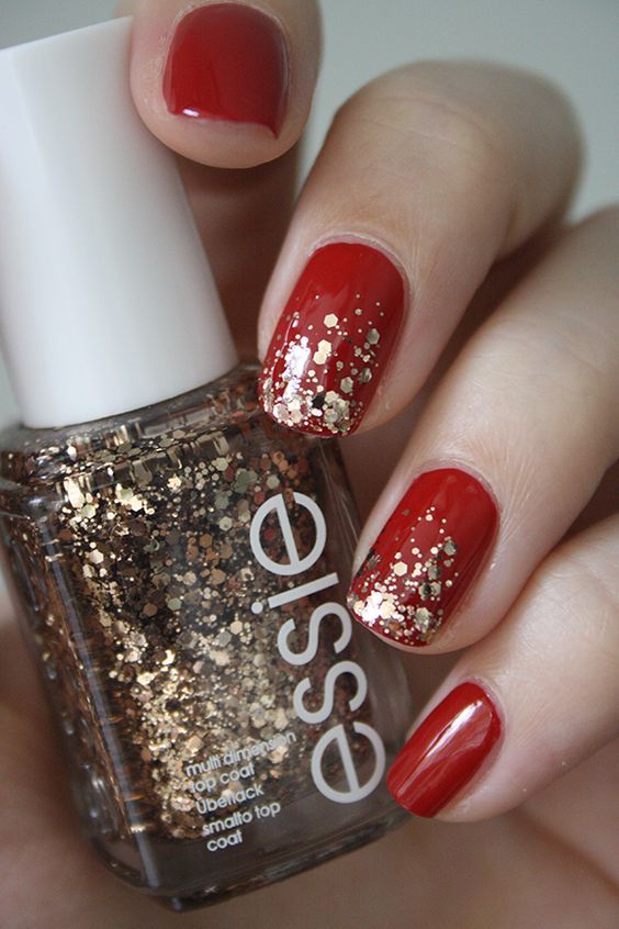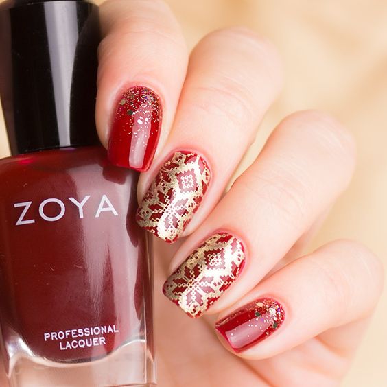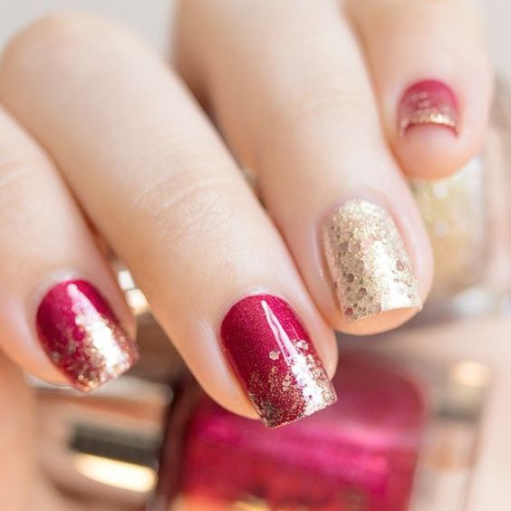 De plus, vous pouvez choisir absolument n'importe quelle nuance de rouge, même de vin ou d'écarlate. En combinaison avec de l'or, chacun d'eux aura l'air vraiment luxueux. Soit dit en passant, le vernis ne doit pas nécessairement être de l'or. N'hésitez pas à choisir des strass dans cette nuance, scotch tape ou même décalcomanies.