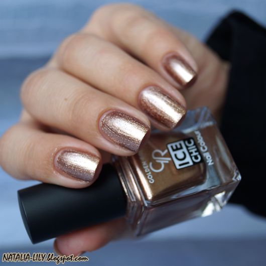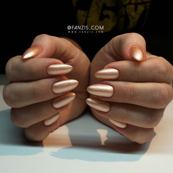 L'option suivante est un vernis avec l'effet de "métal liquide". En le choisissant, vous obtiendrez une lueur douce et uniforme. Une telle manucure est très belle même si vous le faites à la maison. C'est pourquoi il est le plus souvent utilisé pour l'estampage. Pour ce faire, couvrez les ongles avec la teinte principale. À son tour, la couleur or sera utilisée pour transférer le motif sur un ou deux clous. Si vous le souhaitez, vous pouvez compléter une telle manucure avec des strass de petite taille.