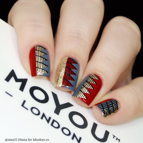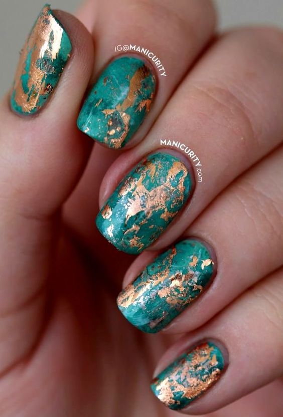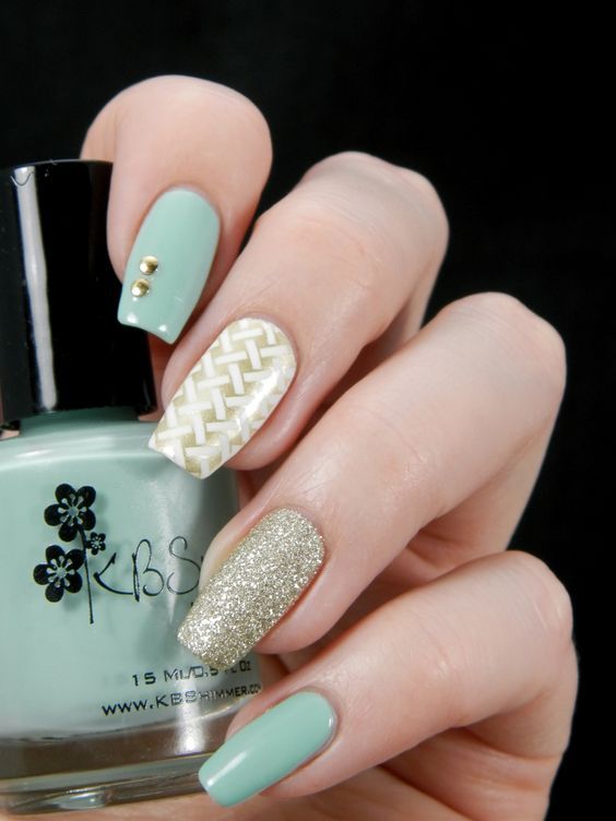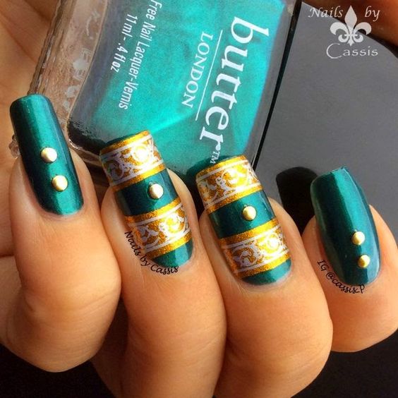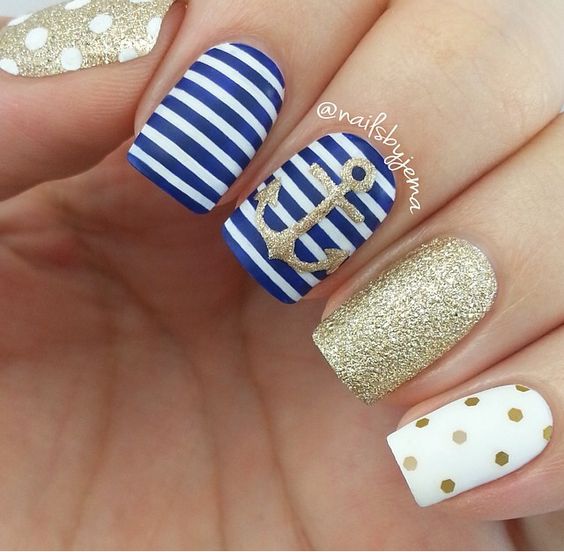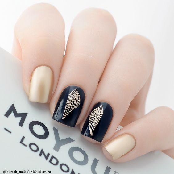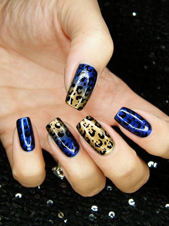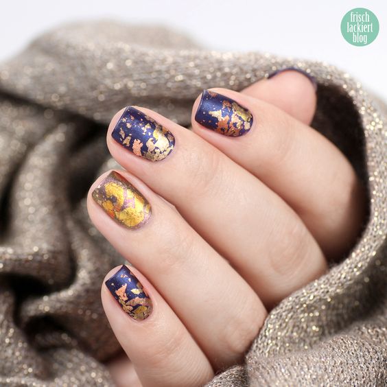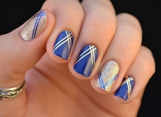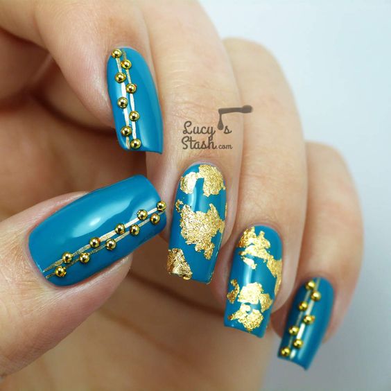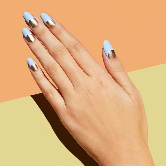 La combinaison de bleu et d'or n'est pas aussi commune que d'autres options. Néanmoins, c'est une excellente solution pour ceux qui ne veulent pas faire un design trop contrasté. Dans ce cas, il vaut mieux utiliser la teinte dorée pour accentuer un ou deux ongles.