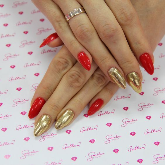 C'est la couleur rouge qui est toujours associée à la passion. À son tour, l'or est un symbole de confiance en soi et de prospérité. En 2026, les concepteurs d'ongles se concentrent sur cette combinaison. Cela n’a rien d’étonnant car même s’il n’ya que deux teintes, elles peuvent être utilisées de différentes manières. Par exemple, une teinte rouge a fière allure en tant que revêtement principal et une couleur dorée convient bien.