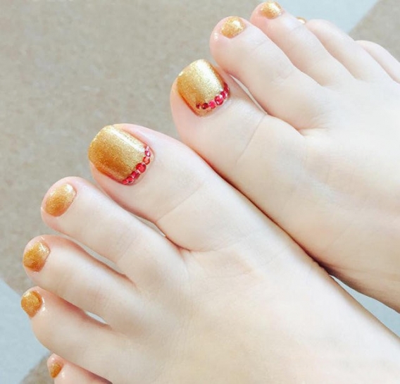 Si vous regardez bien, on peut souvent trouver des pédicures en or dans les films populaires. En effet, la conception lumineuse des jambes féminines attire une attention accrue. Les plaques d’or sur les jambes sont tout simplement condamnées à faire l’objet de toutes les attentions. Mais si vous n'appartenez pas à la catégorie des femmes courageuses, choisissez les éléments dorés de l'ornement. Dans la pédicure dorée, il est d'usage d'utiliser toutes sortes d'options de décoration des ongles. Les éléments brillants, les miroitements, les strass peuvent être complètement appliqués au vernis à l'or ou pour mettre en valeur une certaine partie de l'ongle. Parfois, une pédicure dorée semble extravagante, surtout si elle est complétée par une grande quantité de strass. Dans la pédicure dorée, la règle fonctionne - une interdiction de la conception de nombreux ongles avec des strass. Élément attrayant sur les jambes, le vernis or agit déjà. Où est encore plus d'attention? Les strass, comme d’habitude, sécrètent un ou plusieurs soucis sur les jambes, puis en quantité limitée. Gardez le moins possible de pierres scintillantes dans la pédicure dorée. Il est préférable de placer un grand strazik au centre d'un gros ongle et de l'entourer de petits éléments.